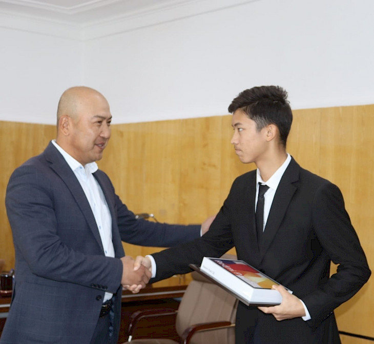 Дүйнөлүк олимпиададан байгелүү кайткан окуучуну президенттин облустагы өкүлү Алтынбек Эргешов кабыл алып, ийгилиги менен куттуктап, ыраазычылык катын жана белегин (планшет) тапшырды.