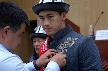 Нарын районунун чебер уздарынын колунан жаралган кооз шырдакты Казакстандан келген коноктор 400 миң сомго сатып алды. Мындан сырткары, көптөгөн шырдактар, кол өнөрчүлүк көргөзмөсүнө коюлган буюмдар сатылып, кардарларын тапты.