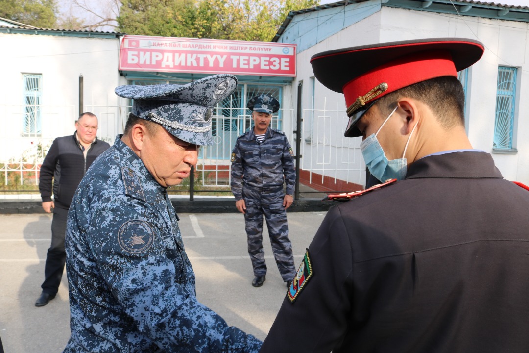 Урмамбетов Жалал-Абад облусунун аймагындагы ички иштер бөлүмдөрүнүн ишмердүүлүгүн, кызматкерлерге түзүлгөн шарттарды текшерүүдө. Ал иш сапардын алгачкы күнүндө Жалал-Абад Токтогул райондук, Кара-Көл жана Таш-Көмүр шаардык ички иштер бөлүмдөрүнүн өздүк курамы менен жолугушту.