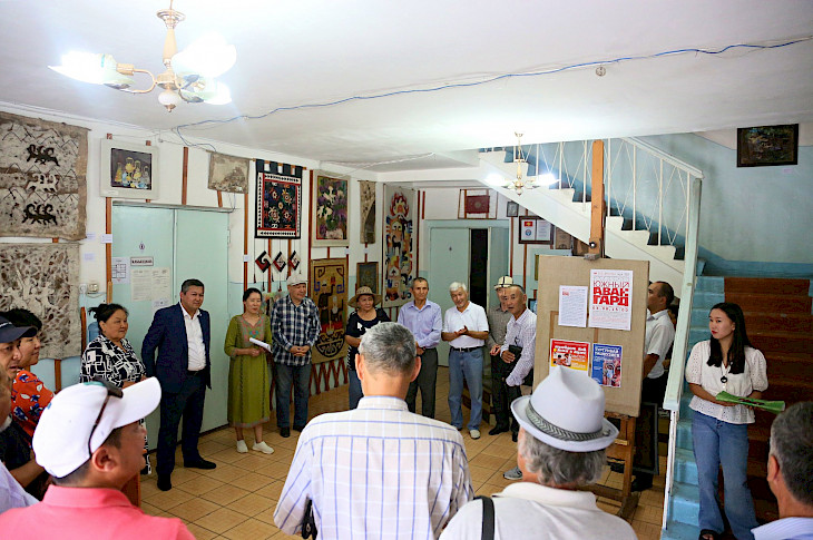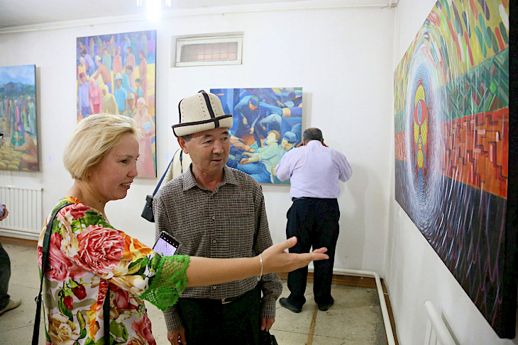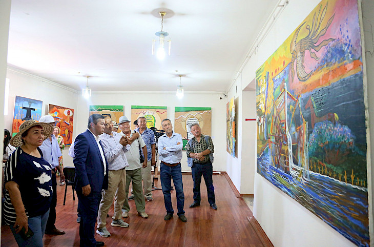 Ачылыш аземинин алкагында Досматов Ош шаарынын мэри Алмаз Мамбетовдун атынан көргөзмөнүн ачылышы менен куттуктап, түштүк аймагынын сүрөтчүлөрүнүн эмгектери ар дайым көз карандысыз көрүүчүлөрдү өзүнө тартып келгенин белгиледи.