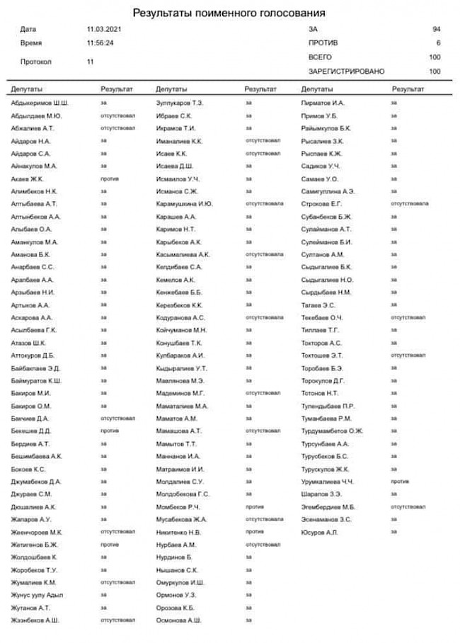 Жалпы жыйынга катышкан 100 депутаттын 94ү референдумду 11-апрелге белгилөөгө макулдугун берсе, алтоо каршы добушун берген.