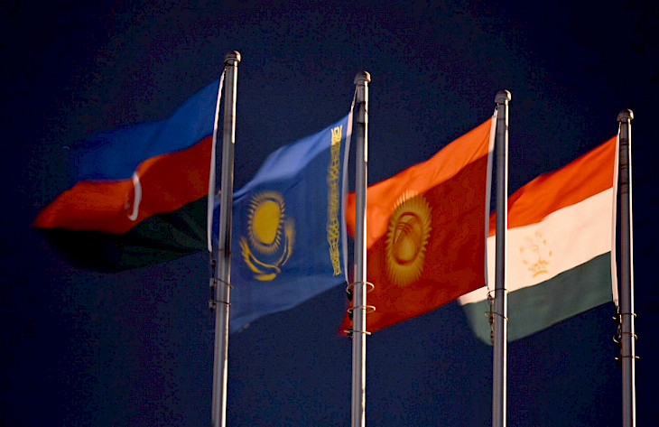 Аэропорттун флагштокторуна СПЕКАга мүчө мамлекеттердин желектери илинип, ардактуу кароолдун ротасы тизилди.