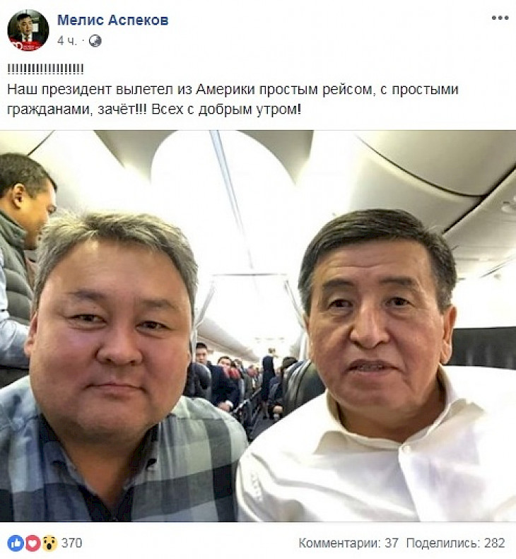 “Биздин президент Америкадан жөнөкөй жарандар менен бирге катардагы каттамда учуп келди. Бардыгыңыздарга кутман таң!”, - деп жазган Аспеков.