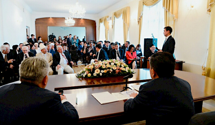 Мындан тышкары Мамлекет башчысы Россиядагы кыргыз диаспорасынын өкүлдөрү жана «Обелиск» москвалык издөө отрядынын өкүлдөрү менен жолугушту. Алар Мамлекет башчысына Ош облусунун Алай районунан Улуу Ата Мекендик согушта курман болгон жоокер Балтабай Борошевдин 2006-жылы табылган медальонун, курунун кемерин жана «Өлбөстүккө кадам» («Шагнувши в бессмертие») медалын анын туугандарына өткөрүп берүү үчүн тапшырышты.