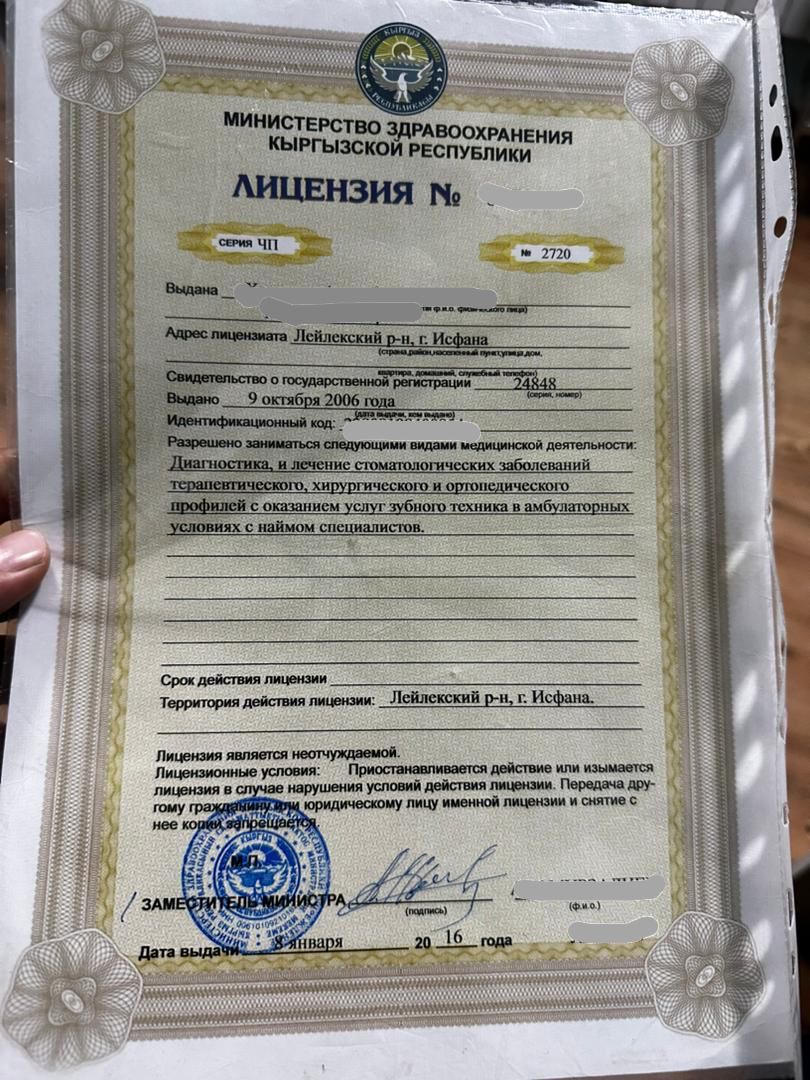 Маалыматка ылайык, УКМК тарабынан КР Кылмыш-жаза кодексинин 379-беренесинин 2-бөлүгүндө (Документтердин жасалмасын жасоо) каралган кылмыштын негизинде козголгон кылмыш ишинин алкагында Лейлек районунун Раззаков шаарында жасалма лицензиянын негизинде мыйзамсыз иштеп жаткан стоматологиялык борбордун ишмердүүлүгү токтотулду.