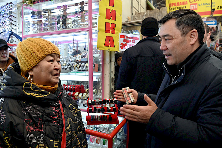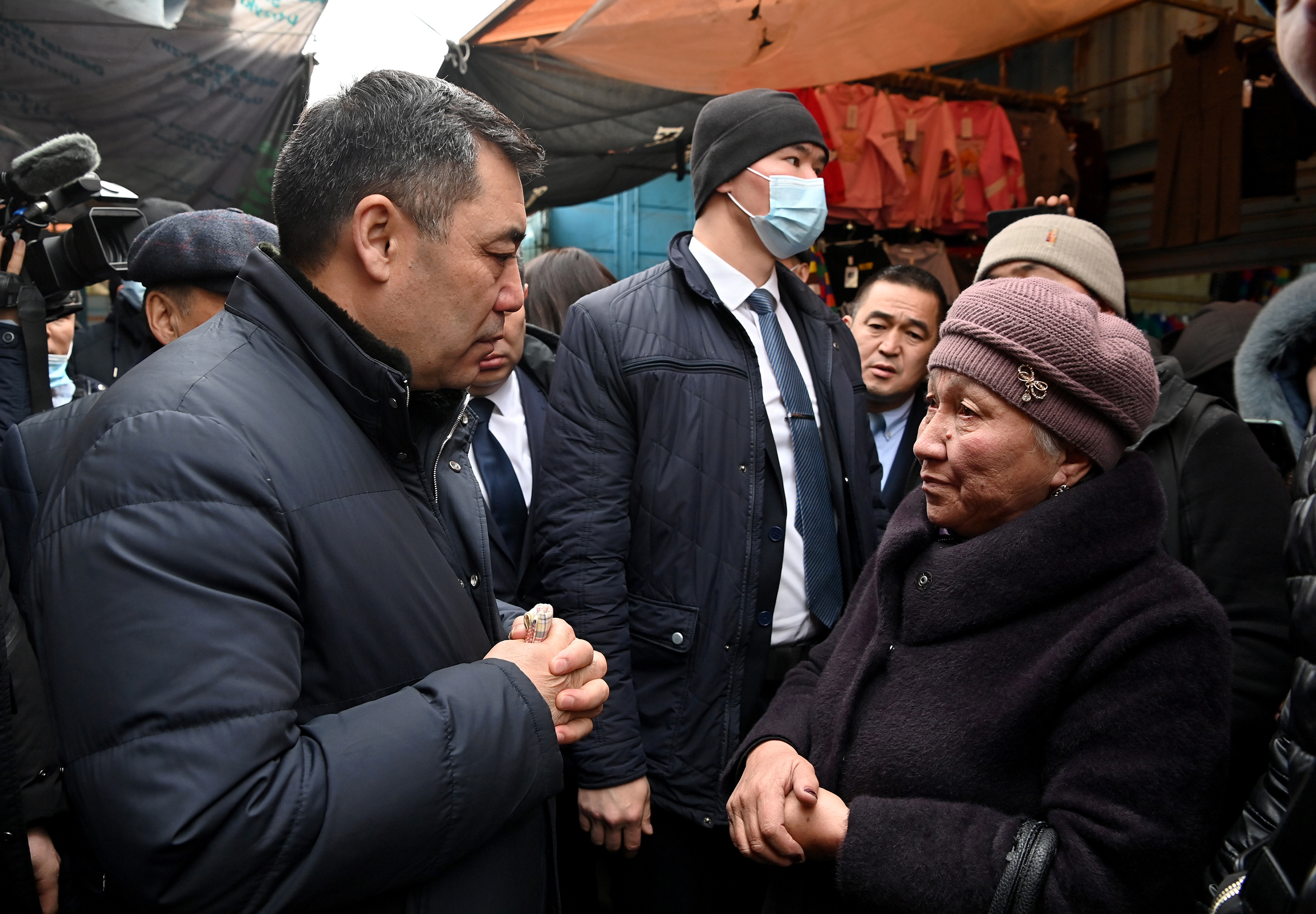 Садыр Жапаров “Дордой” базарынын ишмердүүлүгү менен таанышуу учурунда ишкерлер менен баарлашып, ККМ ишке киргизүү боюнча алардын ой-пикирин угуп, аларды тынчсыздандырган суроолорго жооп берди.