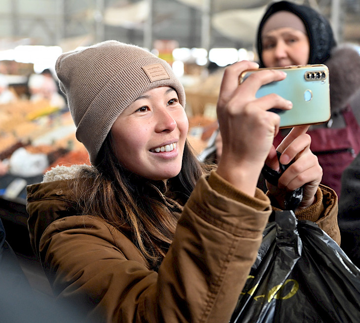 Андан соң, мамлекет башчысы “Ош базарына” барып, ал жерде ККМ системасын ишке киргизүүнүн абалы менен таанышты. Мындан тышкары, Садыр Жапаров азык-түлүктөрдүн баалары, текчелерге коюлган товарлардын ассортименти менен таанышып, базарга келгендер, сатуучулар менен баарлашып, алардын суроолоруна жооп берди, ошондой эле нан азыктарын сатып алды.