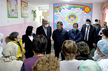 Учурашуу жана чогуу сүрөткө түшүү аземи аяктагандан кийин өлкө лидерлери тар курамдагы жолугушуу залына өтүштү.