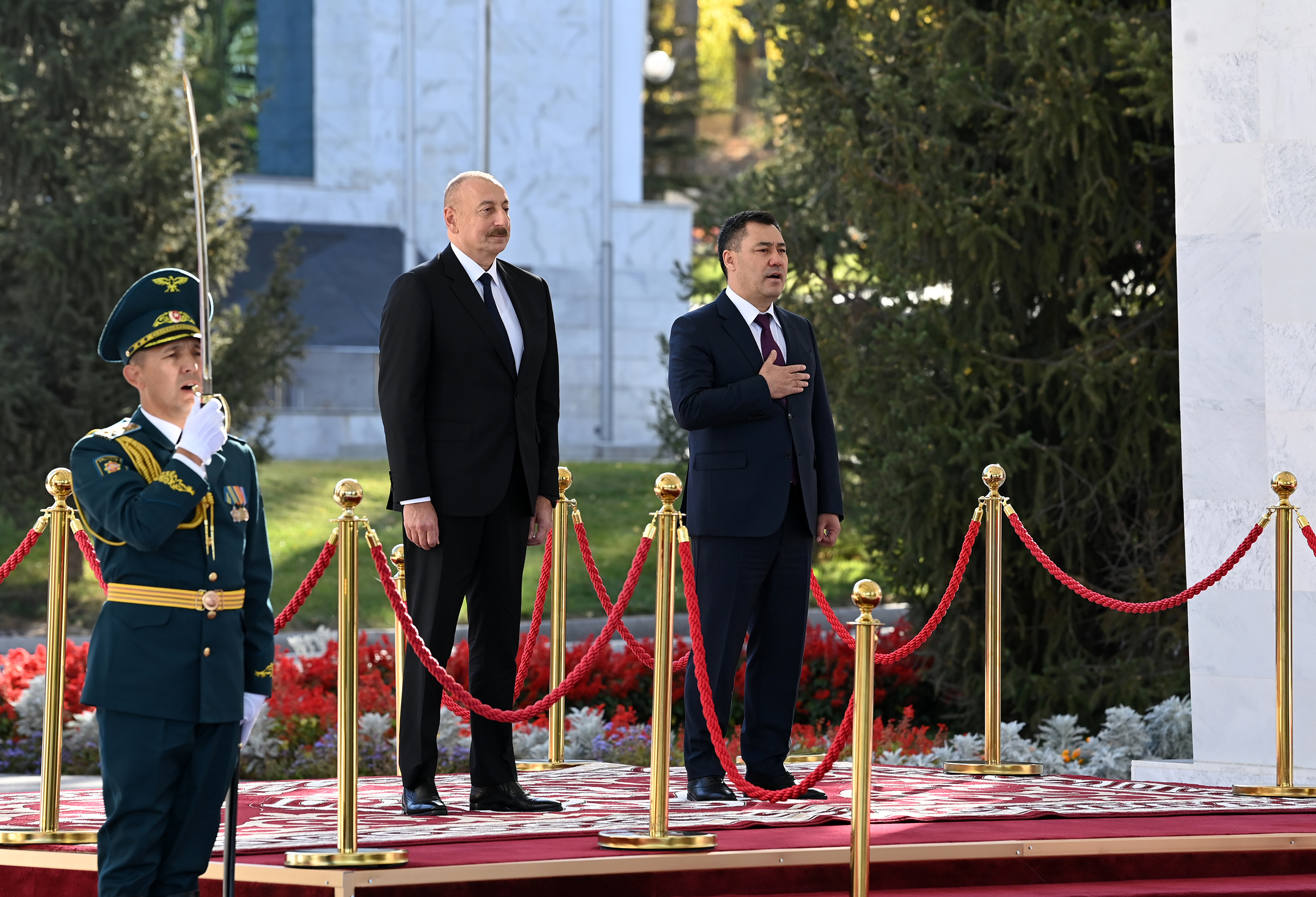 Мамлекет башчыларынын өз ара саламдашуусунан кийин Азербайжан менен Кыргызстандын мамлекеттик гимндери жаңырды. Өлкө башчылары Ардак кароол ротасынын командиринин рапортун кабыл алып, катарды айланып өтүштү.