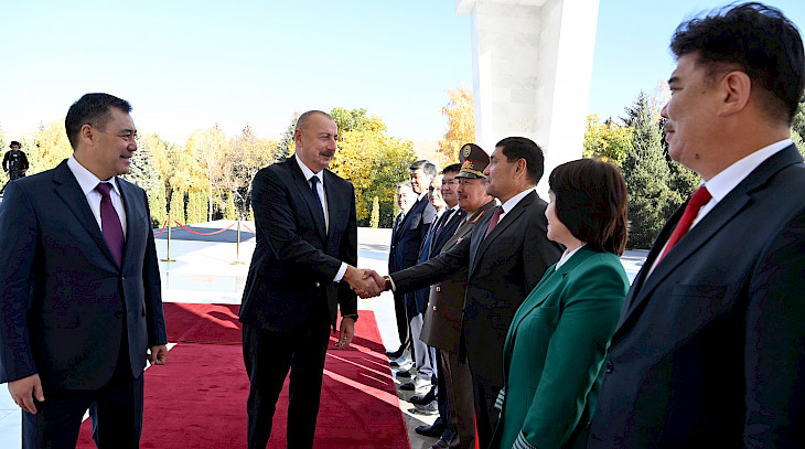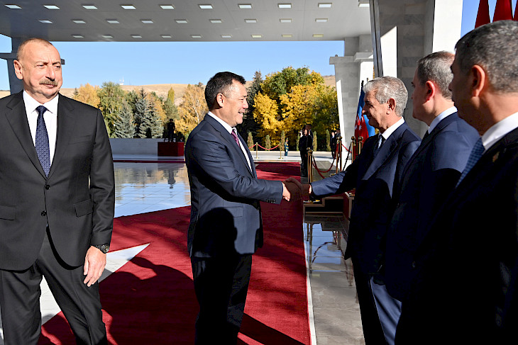 Андан соң Садыр Жапаров менен Ильхам Алиев расмий делегацияларын тааныштырышып, Ардак кароолдун аскер кызматчылары мамлекет башчыларынын алдынан өтүштү.