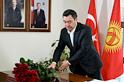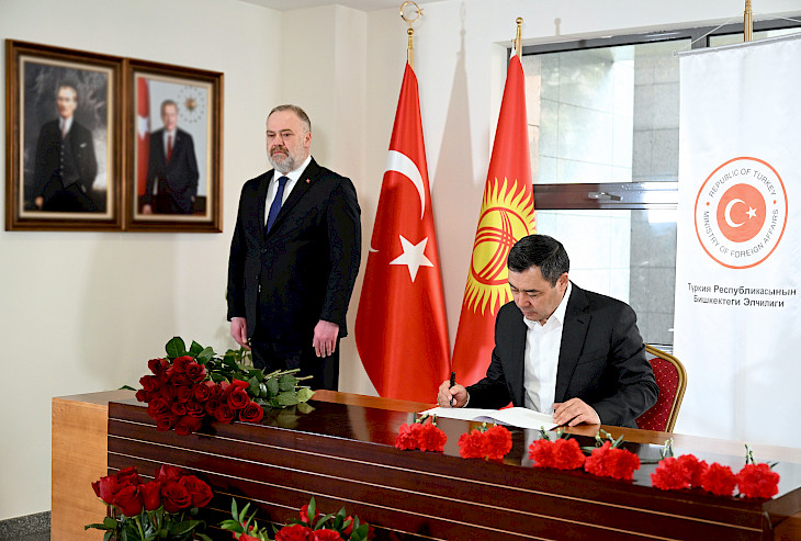 Бишкек, 09.02.23. /Кабар/. Президент Садыр Жапаров бүгүн, 9-февралда Түркиянын Кыргызстандагы элчилигине барып, жер титирөөлөрдүн кесепетинен көп сандаган курмандыктарга байланыштуу түрк элине көңүл айтты. Бул тууралуу президенттин басма сөз кызматы билдирет.