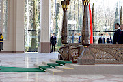 Резиденциянын алдындагы аянтка Кыргызстандын жана Өзбекстандын мамлекеттик туулары илинди. Эки өлкөнүн гимндери жаңыргандан кийин мамлекет башчылары Ардактуу кароол ротасынын тизилген жоокерлерин бойлоп басып өтүштү.