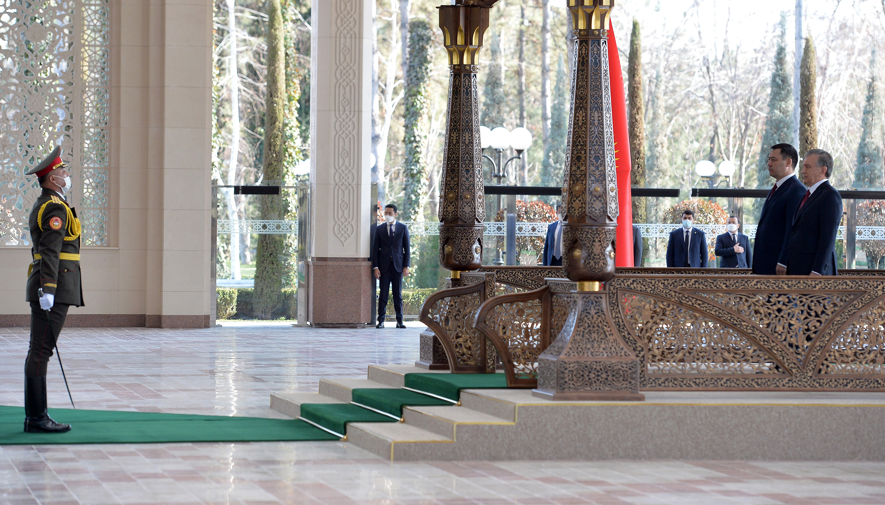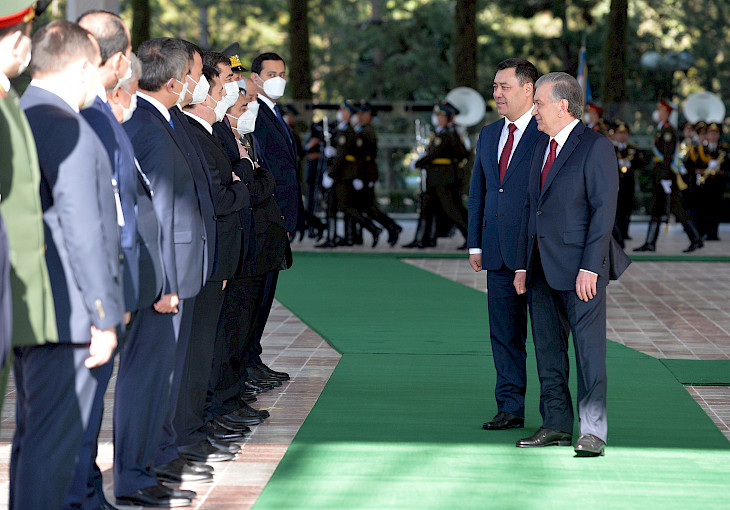 Андан ары Садыр Жапаров менен Шавкат Мирзиёев өздөрүнүн расмий делегацияларынын мүчөлөрүн тааныштырышты. Андан соң Ардактуу кароол ротасы аскердик оркестрдин коштоосунда салтанаттуу марш менен өттү.