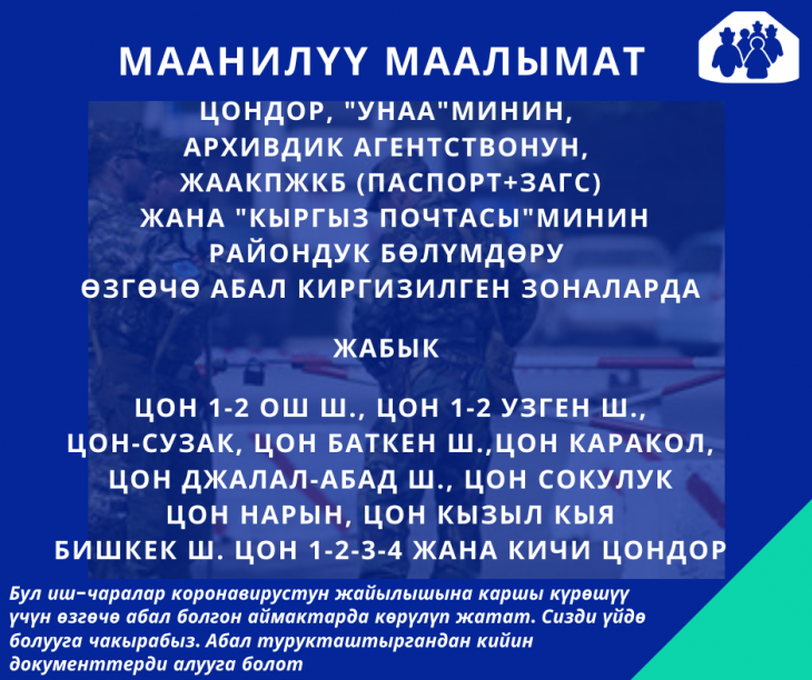 "Коронавирустук инфекция боюнча өлкөдөгү кырдаалга байланыштуу, Чүй облусунун Сокулук районундагы Шопоков шаарындагы Калкты тейлөө борбору шаардык штабдын чечими менен 2020-жылдын 10-апрелинен тартып жарандарды кабыл алууну токтотот. Шаардык жана райондук штабдын талабы боюнча гана иштей турган кызматчылардин иш графиги бекитилди", - деп айтылат маалыматта.