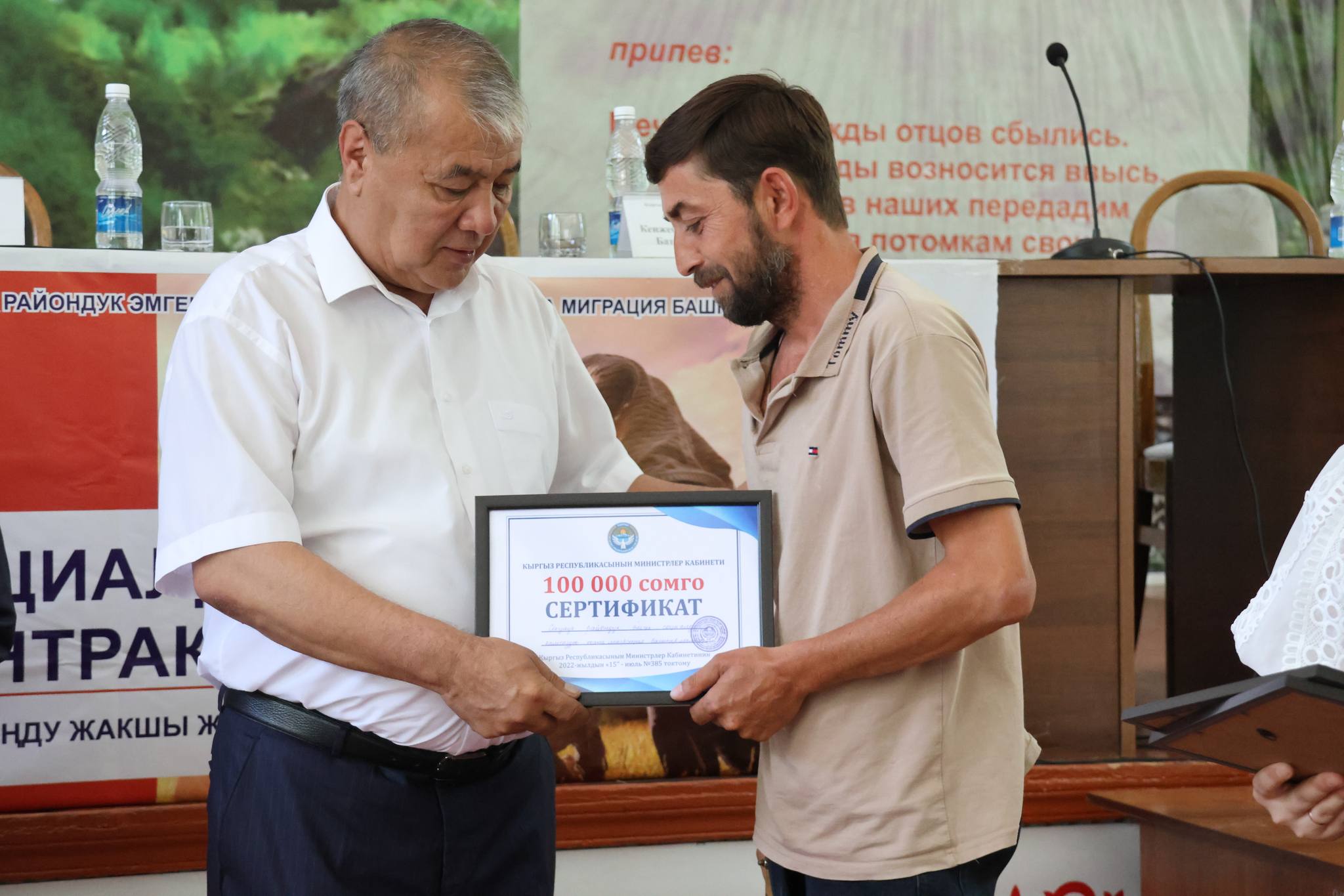Сертификаттарды тапшыруу аземи эмгек министри Жылдыз Полотова, Жогорку Кеңештин депутаты Аманкан Кенжебаев, президенттин Чүй облусундагы ыйгарым укуктуу өкүлүнүн орун басары Гүлмира Кыштобаева, райондун акими Ильяз Ташкулов жана Дүйнөлүк банктын өкүлү Ораз Султановдун катышуусунда өттү.