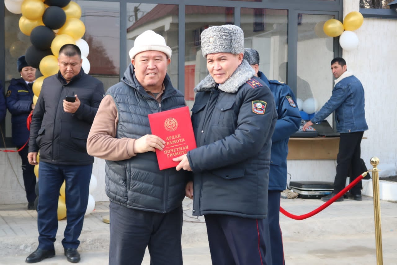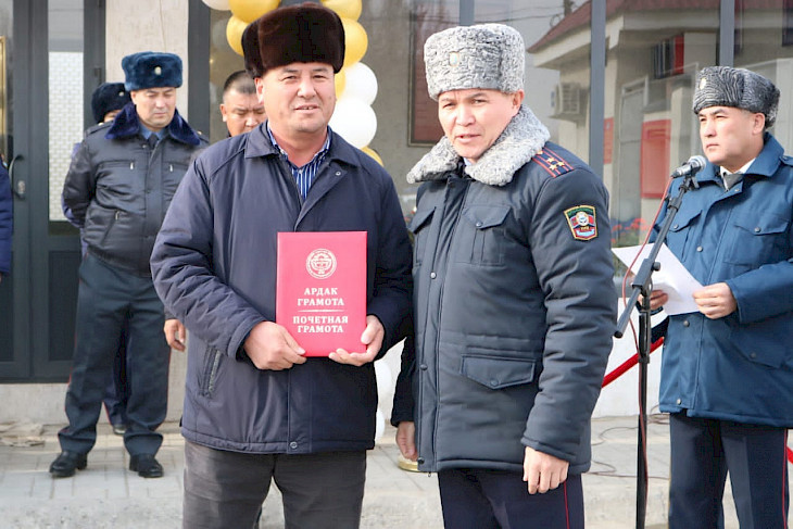 Жалал-Абад ОИИБдин башчысынын орун басары Зарылбек Раимкулов бирдиктүү терезе борборунун курулуш иштерине колдоо көрсөткөн жергиликтүү бийлик өкүлдөрүнө жана демөөрчүлөргө ыраазычылык билдирип, Жалал-Абад ОИИБдин ардак грамоталарын тапшырды.
