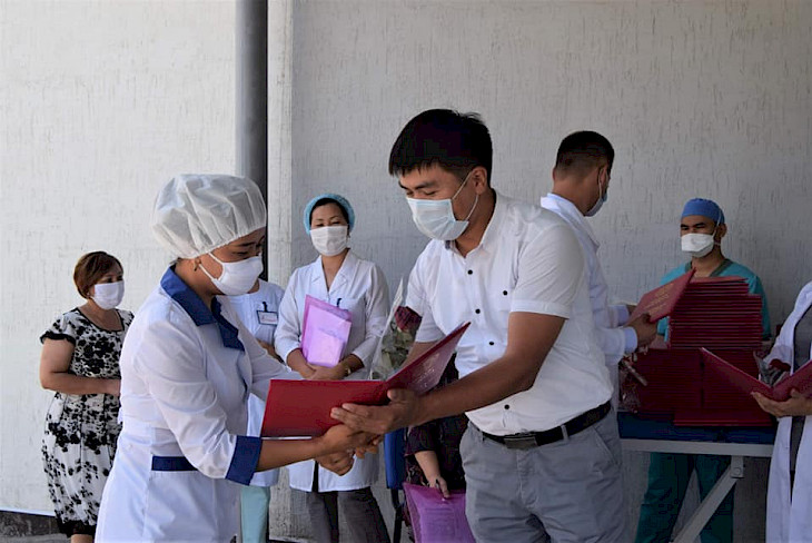"Бул жылы коронавирус илдети менен күрөшүүгө байланыштуу салтанаттуу иш-чара уюштурулган жок. Ага карабай шаар бийлиги ак халатчандарды иштеген мекемесине барып куттукташып, Ардак грамоталар тапшырылды", - деп айтылат маалыматта.