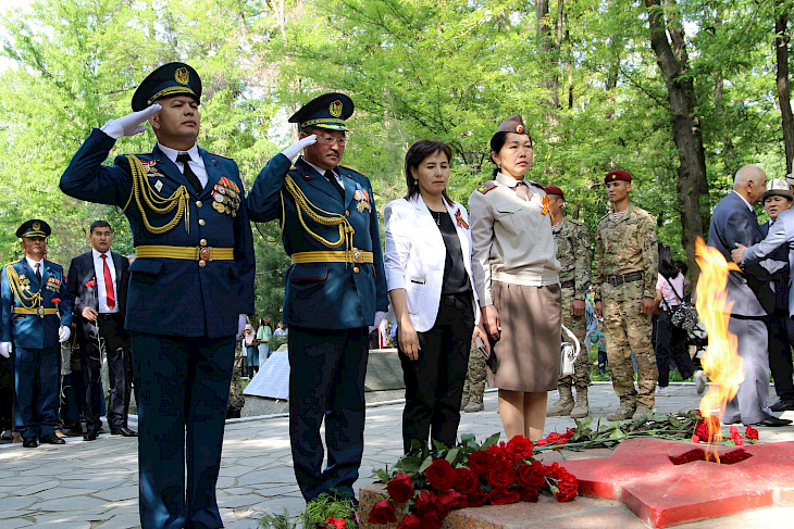 Президенттин облустагы өкүлчүлүгүнөн билдиришкендей, анын алкагында Жеңиш эс алуу багындагындагы "Өчпөс от" мемориалдык комплексине гүл коюлду.