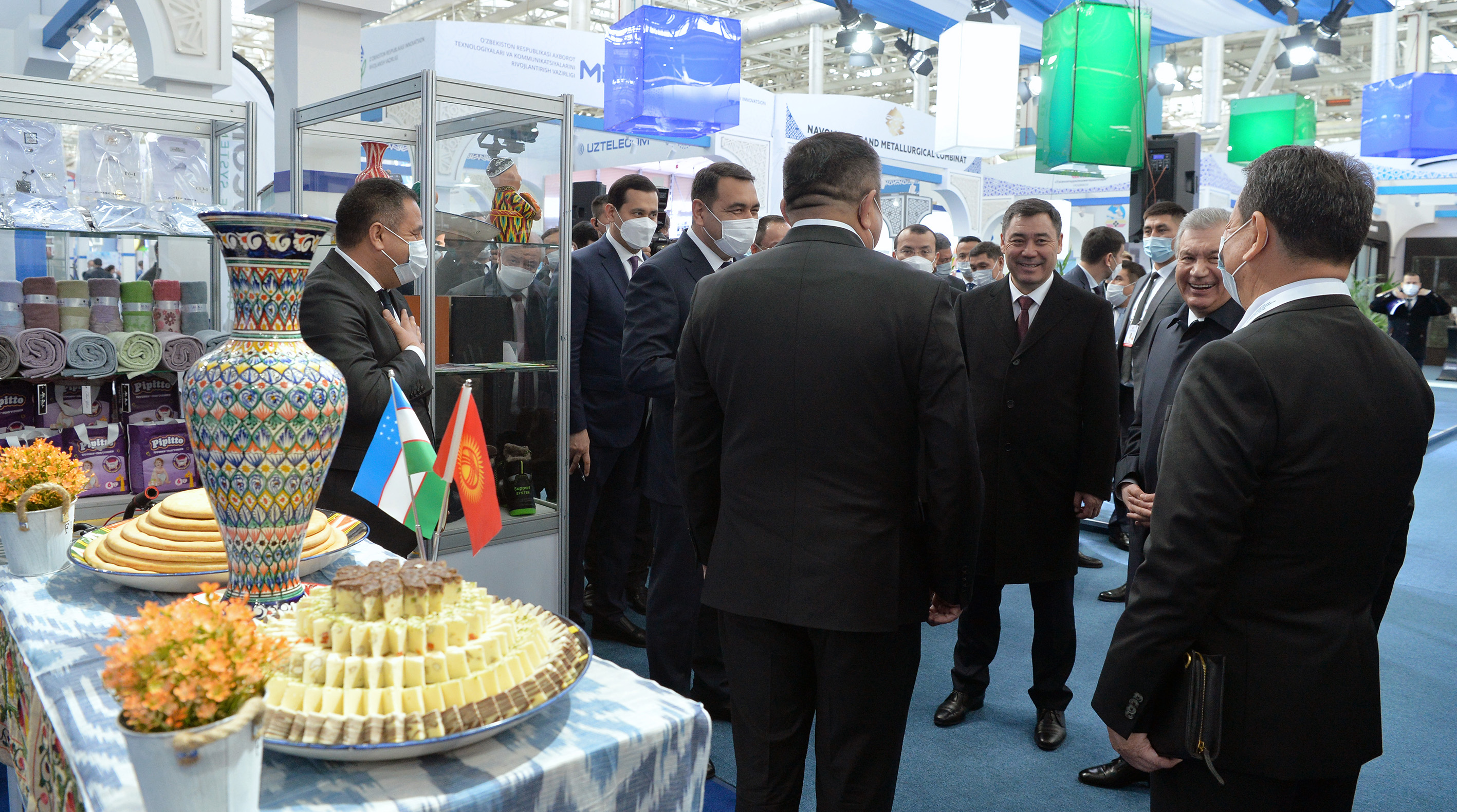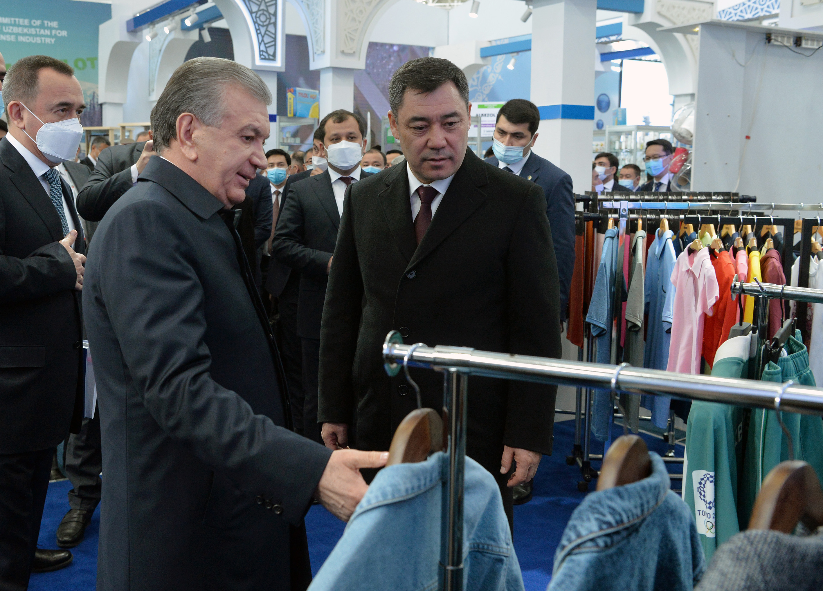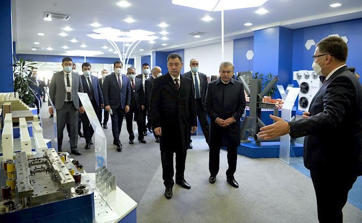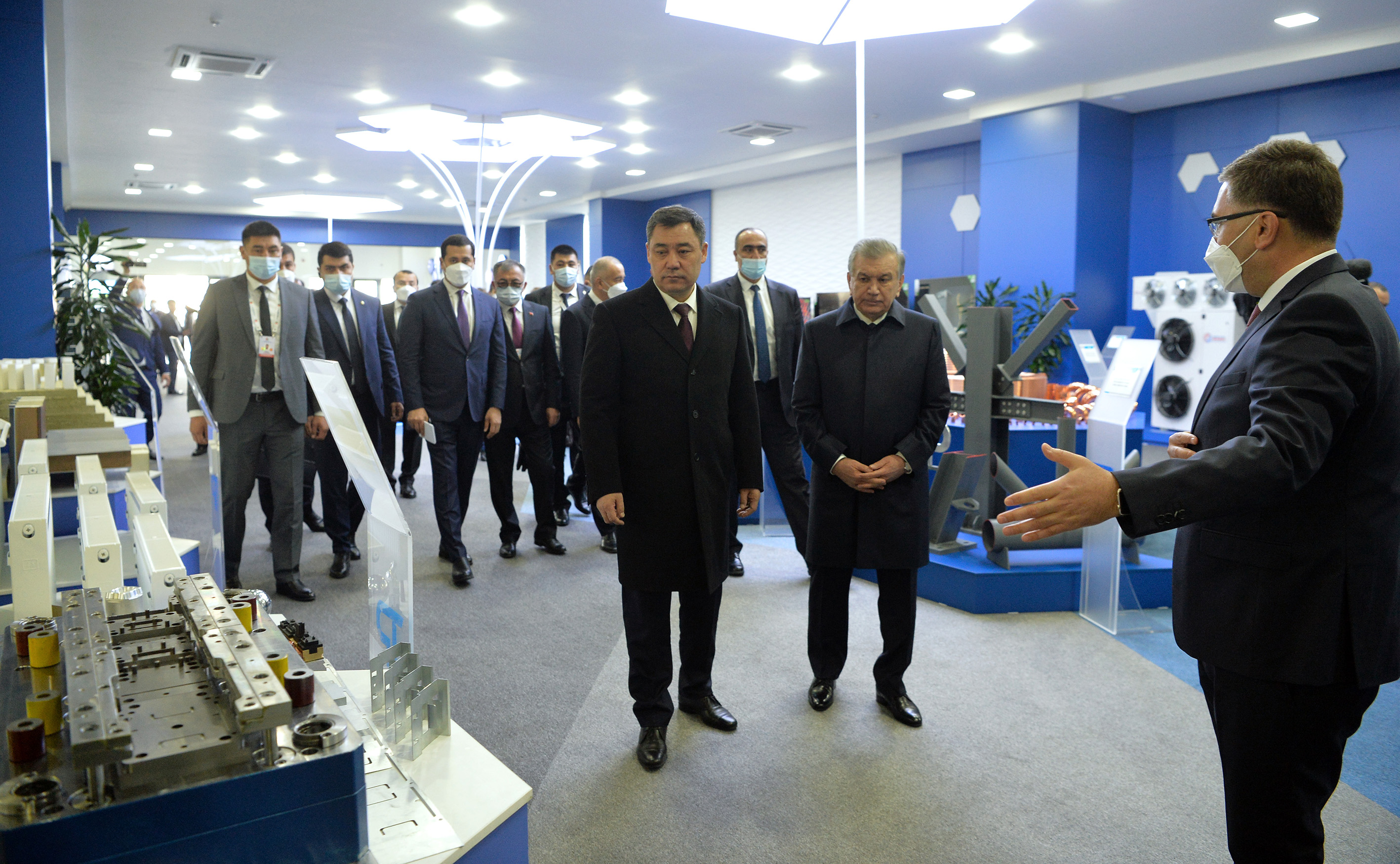 Мамлекет башчылары технопарктын көргөзмө залына барышып, электромобилде өндүрүш цехтерин, Өзбекстанда өндүрүлгөн продукцияларды көрүп чыгышты.