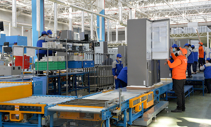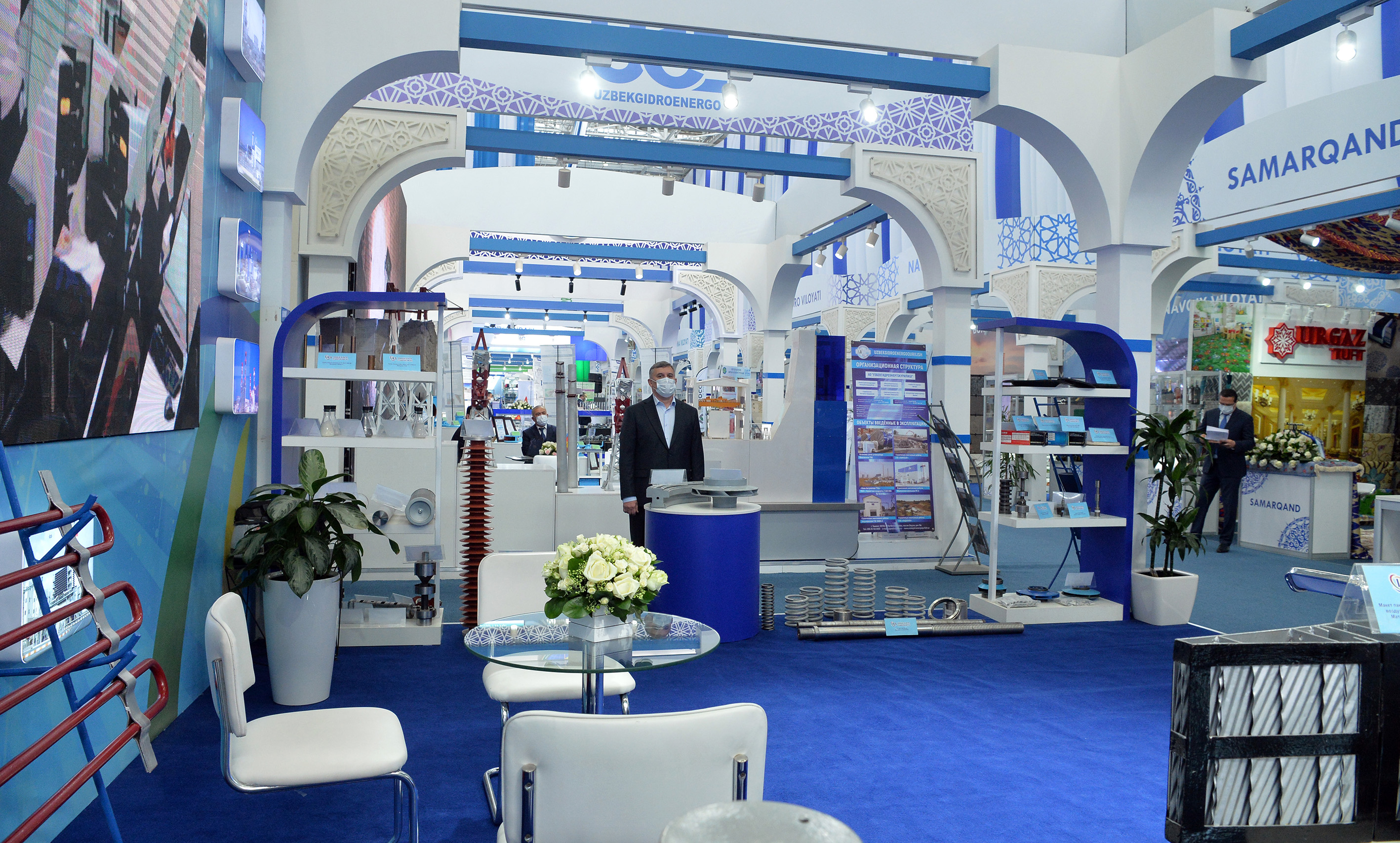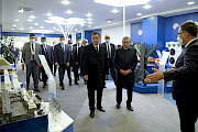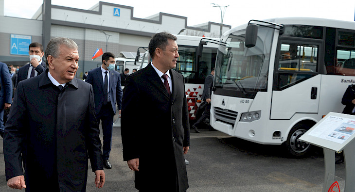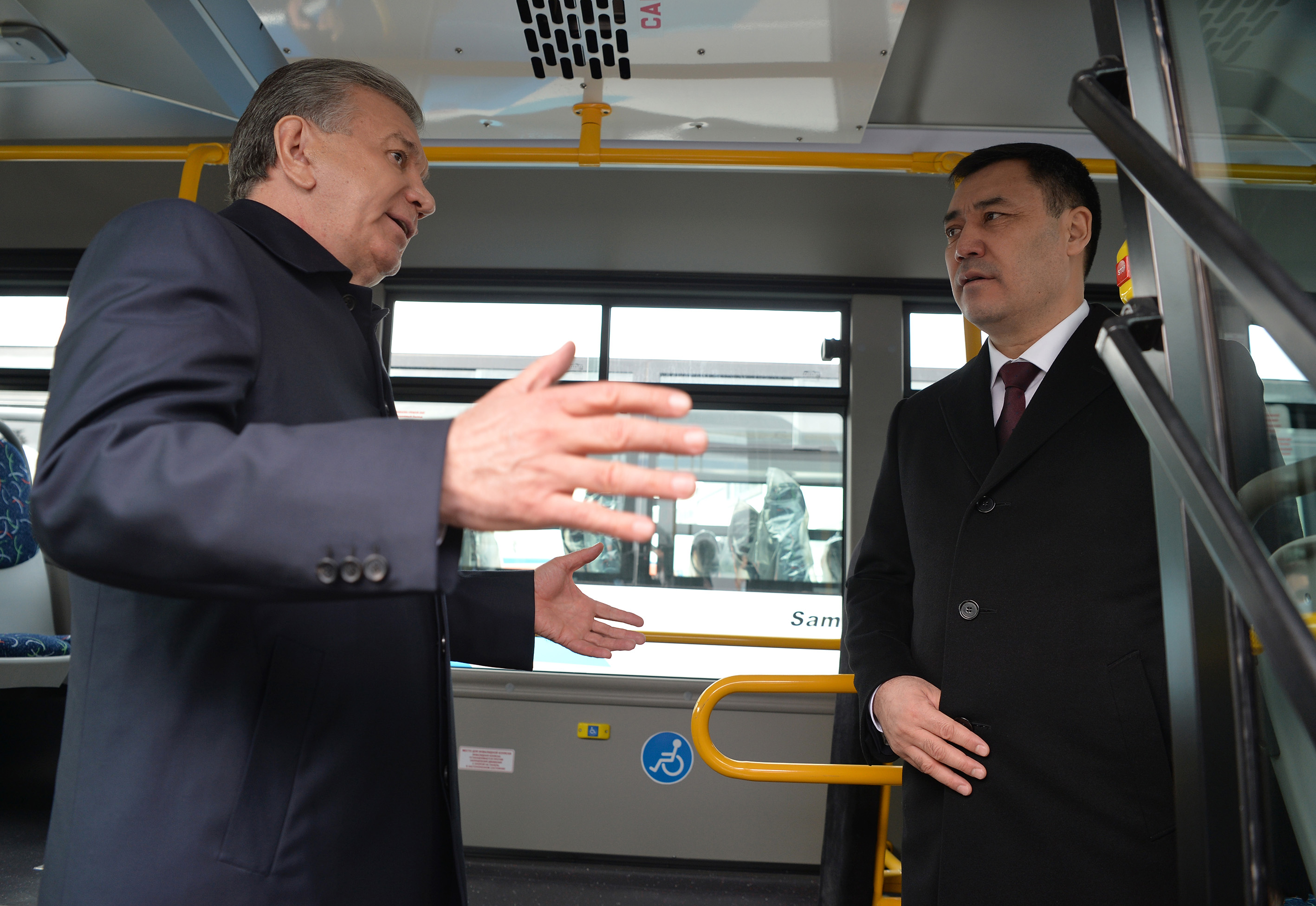 Мамлекет башчылары технопарктын көргөзмө залына барышып, электромобилде өндүрүш цехтерин, Өзбекстанда өндүрүлгөн продукцияларды көрүп чыгышты.