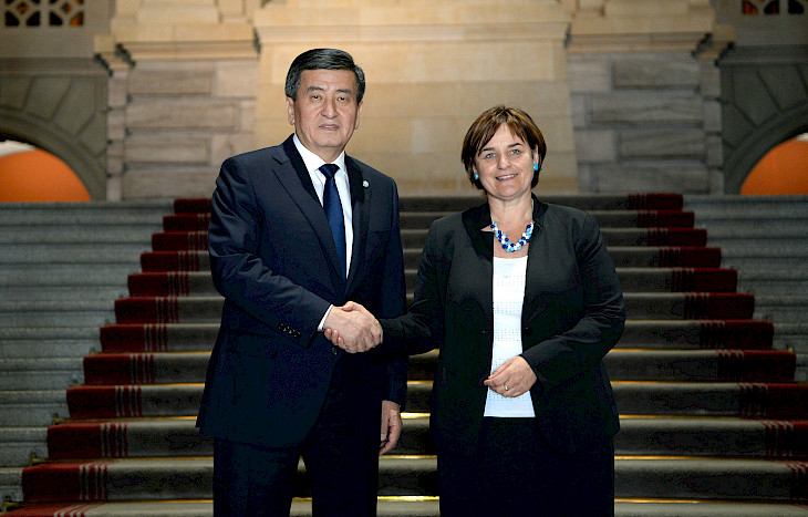 Бишкек, 10.07.19. /Кабар/. «Кыргызстандын парламенттик демократияны бекемдөө боюнча алган багыты уланат», — деп баса белгиледи Кыргыз Республикасынын Президенти Сооронбай Жээнбеков бүгүн, 10-июлда, Швейцариянын Берн шаарында Швейцария Конфедерациясынын федералдык жыйынынын Улуттук кеңешинин төрайымы Марина Кароббио менен болгон жолугушууда.