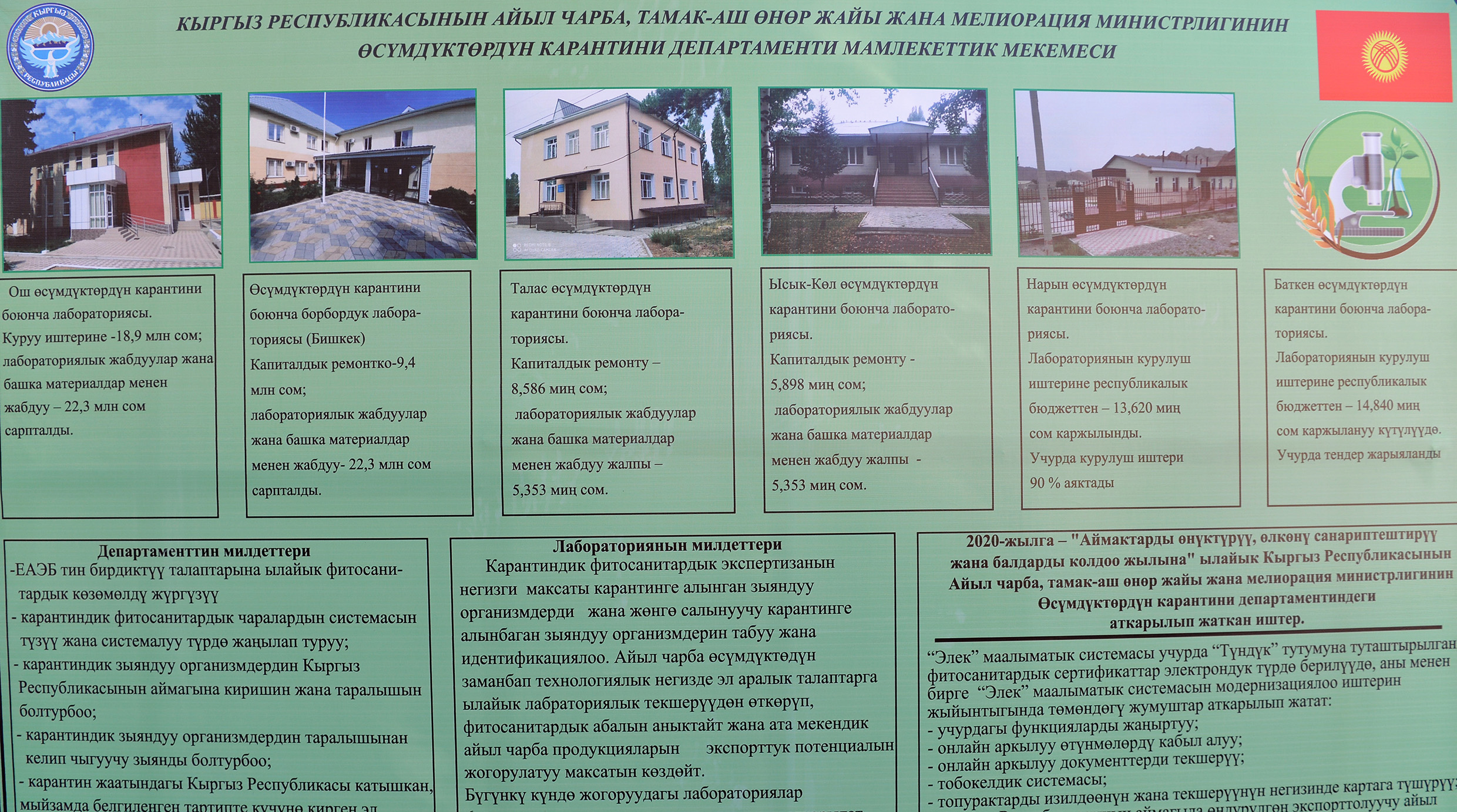 Ошондой эле өкмөттөр аралык макулдашуунун алкагында лаборатория 17,5 млн сомго заманбап лабораториялык эмеректер жана жабдуулар менен камсыздалган.