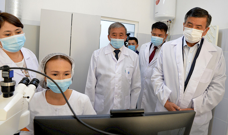 Президент Сооронбай Жээнбеков жаңы эки кабаттуу имаратты, колдонулуп жаткан аппараттарды, ошондой эле автоунаанын базасында түзүлгөн, зарыл болгон жабдыктар менен жабдылган мобилдик лабораторияны көрүп чыкты.