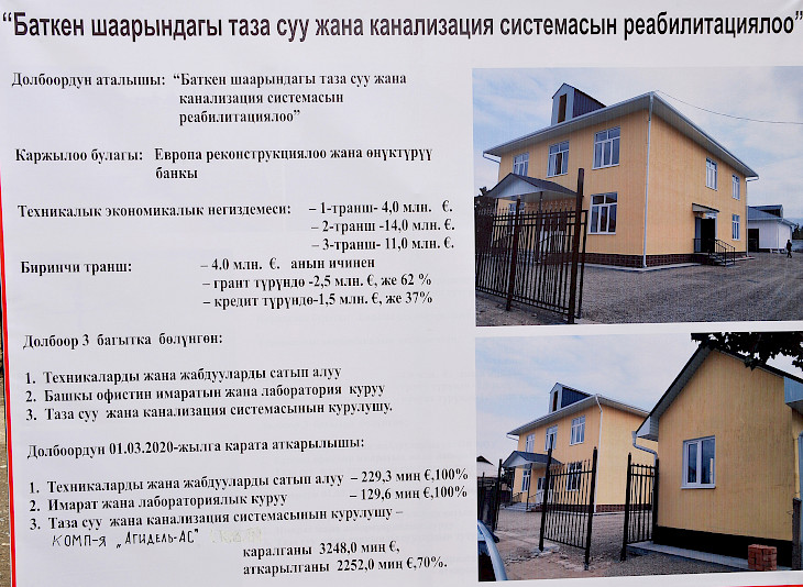 Долбоорду ишке ашыруунун алкагында Баткен шаарында «Таза суу» муниципалдык ишканасынын жаңы имараты курулуп, керектүү техникалар менен жабдуулар алынган, жаңы канализациялык тутумдардын курулушу аяктоо алдында турат.
