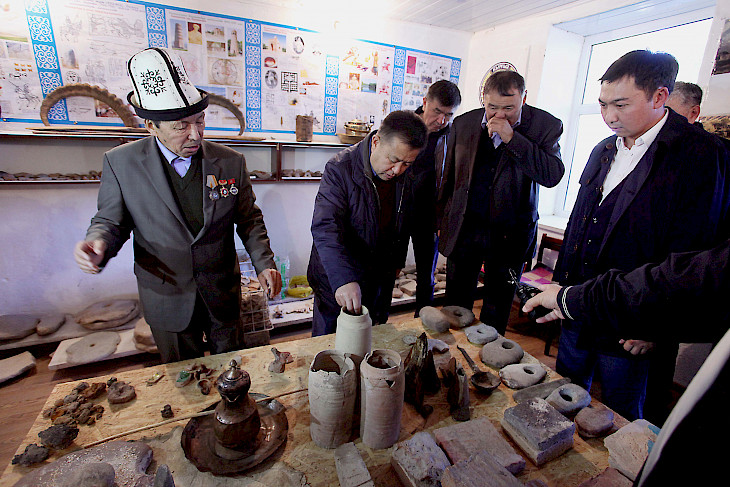 Андан соң Жогорку Кеңеш Төрагасы өз алдынча тарыхый жайларды изилдеп, үй музей ачкан Кайырбек Коңурбаев менен жолугушуп, анын археологиялык табылгалары менен таанышты. Белгилүү болгондой, Кайырбек Коңурбаев айылдагы айдоо жерлерден табылган байыркы шаар имараттарынын калдыктарын кырк жыл бою өз алдынча изилдеп, жер үстүнө чыгып калган тарыхый табылгаларды чогултуп үйүнө музей ачкан.