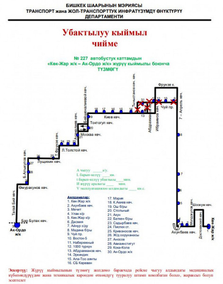 Буга байланыштуу № 7, 11, 17, 21, 31, 34, 36, 38, 42, 50, 104, 135, 152, 166, 216, 222, 227-автобустук каттамдардын кыймыл схемалары убактылуу өзгөртүлдү.