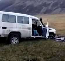 Маршрутканын эшигин ачып айдап бараткан айдоочуга ...